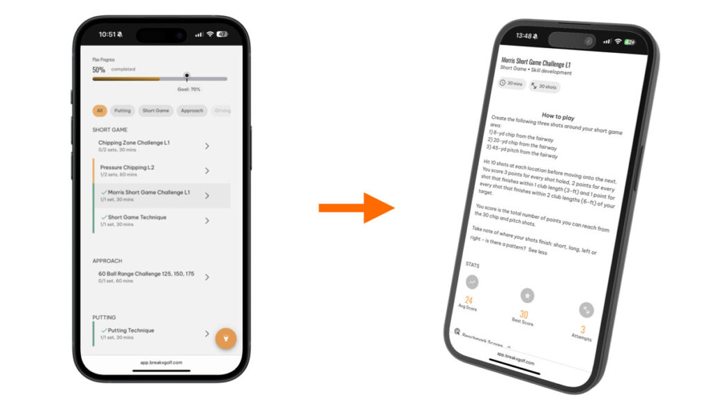 Once you enter your data, Break X Golf instantly generates a personalised practice plan based on the time you have to practice. It: